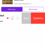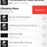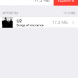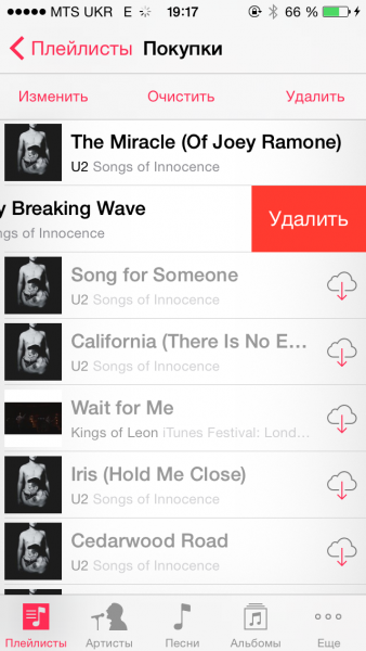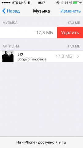 Особое внимание следует уделить удалению музыки, тем более что именно она занимает львиную долю всей памяти. Для удаления необходимо зайти в раздел "Музыка" и выбрать соответствующий трек или альбом, в зависимости от того, что именно вы хотите удалить. Свайп влево откроет окно "Удалить".