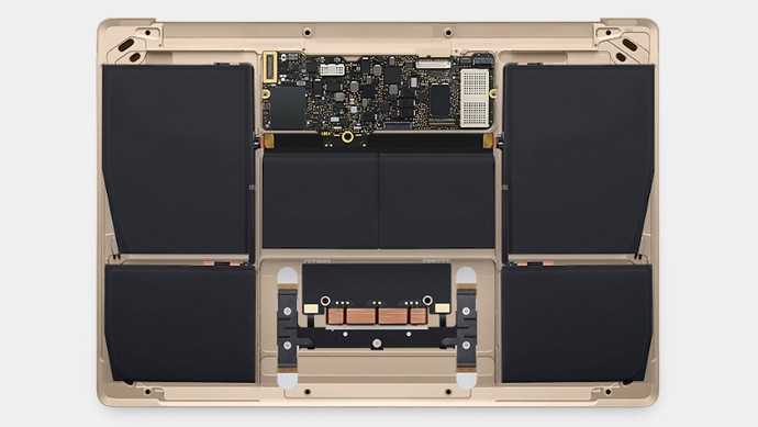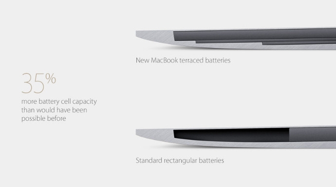 Конечно, главные особенности MacBook спрятаны внутри самого устройства. В первую очередь -это процессор Intel Core M Broadwell на 14 нанометров. Его частота - 1,3 ГГц и 2,9 в режиме "турбо". Автономная работа ноутбука в режиме веб-серфинг возможна в течение 9 часов, просмотр видео - до 10 часов. Все это возможно благодаря встроенному "слоеному" аккумулятору, который занимает практически все пространство корпуса.