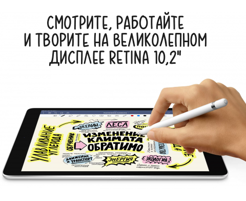 Благодаря чипу A13 Bionic новый iPad реагирует быстрее в любой ситуации: когда вы отправляете сообщения, ищете контент в интернете или используете одновременно несколько приложений. Графический процессор обрабатывает изображения и видео до 20 процентов быстрее. Поэтому он идеально подходит, чтобы играть в игры со сложной графикой и делать множество других дел. Ещё более мощная система Neural Engine обеспечивает работу функций, в основе которых лежит машинное обучение. Например, Онлайн-текст в iPadOS 15. Заряда аккумулятора хватает на целый день, так что вы можете работать и играть на iPad столько, сколько вам нужно. На дисплее Retina 10,2 дюйма цвета отображаются ярко, а мельчайшие детали — удивительно чётко. Он идеален для просмотра фильмов и работы над вашим следующим шедевром. Технология True Tone автоматически настраивает цветовую температуру в соответствии с окружающим освещением, чтобы смотреть на дисплей всегда было комфортно.
