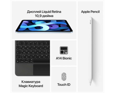 10.9" IPS (2360x1640), iPadOS. Шестиядерный процессор A14 выполнен по техпроцессу 5 нм — это позволило вместить 11,8 миллиарда транзисторов. Чип на 40% быстрее того, что использовался в предыдущем iPad Air, также увеличилась производительность графики на 30%. Сканер отпечатков Touch ID встроен в кнопку включения. Многое из того, что недоступно компьютеру, легко и волшебно делается на iPad Air. И теперь возможности iPad Air стали ещё шире и разнообразнее. Мощный процессор A14 Bionic поможет вам воплощать свои идеи в жизнь. Снимайте видео 4K и монтируйте его прямо на iPad Air. Благодаря Apple Pencil 2-го поколения вы сможете создавать прекрасные рисунки и иллюстрации с плавными тональными переходами — кисти можно менять прямо в процессе работы. А процессор A14 Bionic с расширенными возможностями обработки графики и усовершенст­вованными технологиями машинного обучения откроет новые перспективы для творчества. Редактируйте фото, пишите музыку — вы сможете реализовать свой потенциал как захотите. аутентификации.