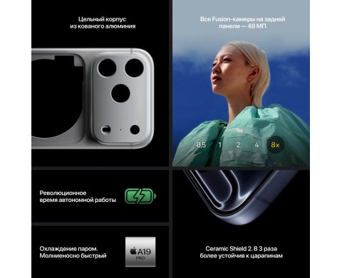 Компактный «профи» с тем же уровнем камер и производительности, что iPhone 17, но в 6,3″ форм-факторе. A19 Pro, алюминиевый unibody и Ceramic Shield 2 на фронте обеспечивают скорость, холодный старт и стойкость, а тройной 48-МП модуль с тетрапризмой даёт до 8× «оптического качества» зума и супердеталь даже в ночи. 18-МП селфи-камера Center Stage, ProMotion-экран, Camera Control и Action Button — всё, как у Max, плюс быстрый USB-C (USB 3) и Wi-Fi 7. Лучше выбрать, если хочется «топ» без увеличения габаритов.