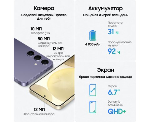 Android, экран 6.7" AMOLED (1440x3120) 120 Гц, Exynos 2400, ОЗУ 12 ГБ, память 256 ГБ, камера 50 Мп, аккумулятор 4900 мАч, 2 SIM (nano-SIM/eSIM), влагозащита IP68
