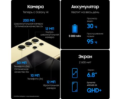 | Характеристики камеры | 200 Мп, f/1.7, 24мм, 85˚, 1/1.3", 0.6мкм, оптическая стабилизация, широкоугольный 50 Мп, f/3.4, 111мм, 22˚, 5x оптический зум, оптическая стабилизация, перископический телеобъектив 10 Мп, f/2.2, 67мм, 36˚, 1/3.52", 1.12мкм, 3x оптический зум, оптическая стабилизация, телеобъектив 12 Мп, f/2.2, 13мм, 120˚, 1/2.55", 1.4мкм, сверхширокоугольный |