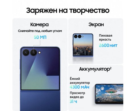 Android, экран 6.9" AMOLED (1080x2520) 120 Гц, Samsung Exynos 2500, ОЗУ 12 ГБ, память 512 ГБ, камера 50 Мп, аккумулятор 4300 мАч, со складным экраном (flip), влагозащита IP48