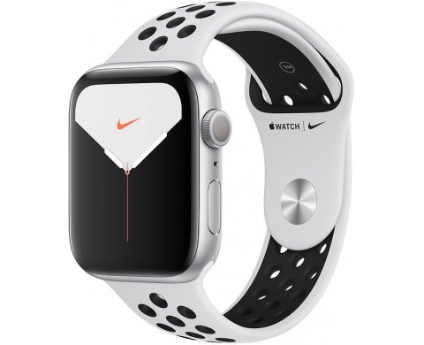Apple Watch Nike Series 5 (MX3V2RU/A), 44 мм, корпус из алюминия серебристого цвета, спортивный ремешок Nike «чистая платина/чёрный»