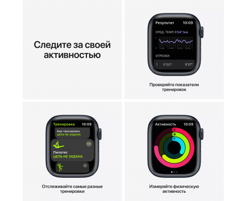 Спецификация Apple Watch Nike Series 7, 41 мм, корпус из алюминия цвета «тёмная ночь», спортивный ремешок Nike цвета «антрацитовый/чёрный» (MKN43)