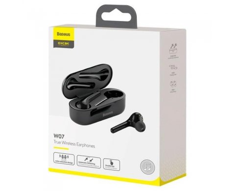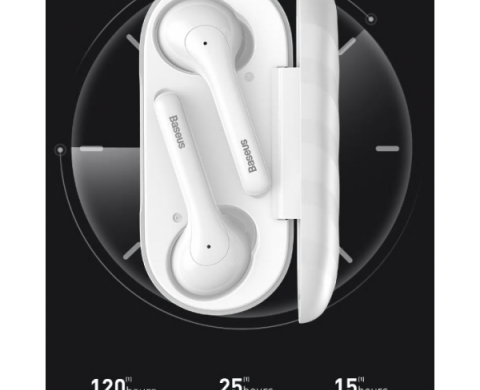 BaseusEncok W07 – это качественные беспроводные наушники. В режиме музыки они работают целых три часа. Достигается это за счет мощного аккумулятора емкостью 30 mAh в одном наушнике и 500 mAh в боксе для хранения.