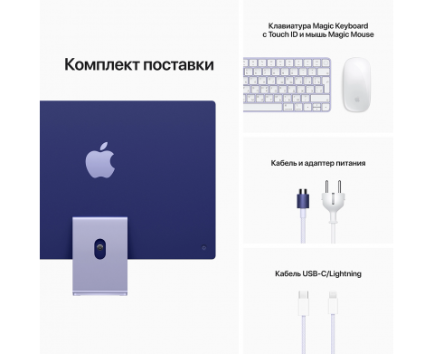 Такой невероятный дизайн стал возможным благодаря чипу M1 — первой системе на чипе, созданной для Mac. Тонкий и лёгкий, этот iMac поместится где угодно. Чип M1 объединяет в себе центральный и графический процессоры, память и ряд других компонентов. Поэтому нам удалось поместить такую мощь в такой тонкий корпус. На превосходном дисплее Retina 24 дюйма с разрешением 4,5K всё видно чётко, и вы сможете рассмотреть каждую деталь.2 Широкий цветовой охват P3 обеспечивает реалистичную передачу изображения с помощью более миллиарда цветов. Яркость дисплея составляет 500 кд/м², поэтому картинка получается очень насыщенной. При этом специальное антибликовое покрытие уменьшает нагрузку на глаза, а технология True Tone автоматически настраивает цветовую температуру в соответствии с окружающим освещением, делая изображение ещё более естественным. Фотографии, презентации, фильмы и сериалы — на iMac всё выглядит превосходно. Улыбнитесь, вас снимает камера FaceTime HD 1080p. Это лучшая камера для Mac. Она обеспечивает в два раза более высокое разрешение во время видеозвонков.3 Увеличенная матрица улавливает больше света. Передовой процессор обработки сигнала изображения в чипе M1 существенно повышает качество изображения. Теперь, обсуждая рабочие моменты или общаясь с друзьями по видеосвязи, вы можете быть уверены, что выглядите потрясающе.