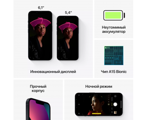 Apple iOS, экран 5.4" OLED (1080x2340), Apple A15 Bionic, ОЗУ 6 ГБ, флэш-память 512 ГБ, камера 12 Мп, поддержка двух SIM-карт (nano-SIM и eSIM).