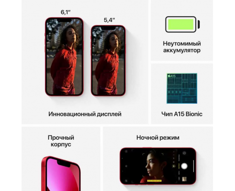 Apple iOS, экран 5.4" OLED (1080x2340), Apple A15 Bionic, ОЗУ 6 ГБ, флэш-память 512 ГБ, камера 12 Мп, поддержка двух SIM-карт (nano-SIM и eSIM).